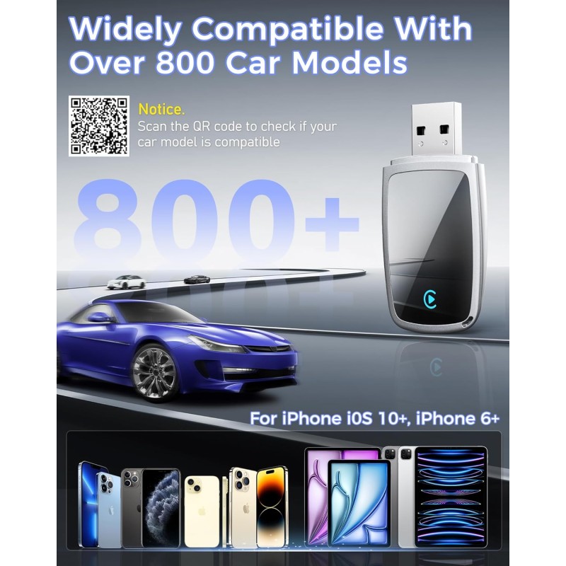 - New Upgraded Dual Chips: Our wireless CarPlay adapter is equipped with 5.8 GHz WiFi, Bluetooth 2.4GHz. Optimized performance for smoother connectivity ensure greater stability and near-zero latency. Experience lightning-smooth CarPlay performance for seamless music playback, navigation, and hands-free calling