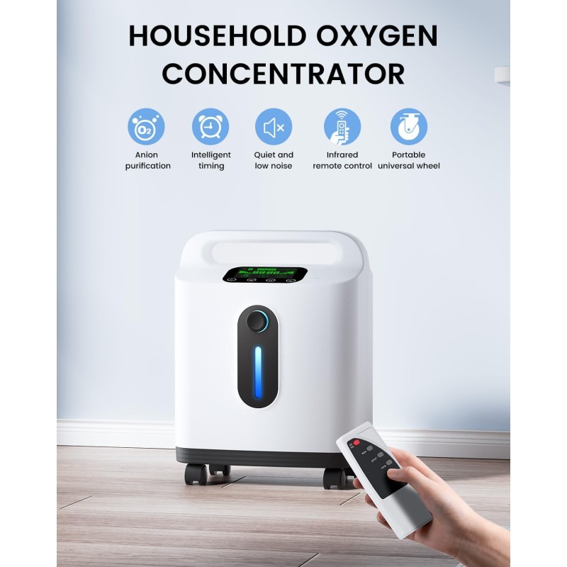 - This home oxygen concentrator operates in continuous flow mode with an adjustable oxygen output ranging from 1 to 9 liters per minute (L/min). Oxygen concentration varies from 95% to 35% (inversely proportional to flow rate). IMPORTANT: This device is NOT INTENDED FOR MEDICAL USE and provides supplemental oxygen support solely in home environments.