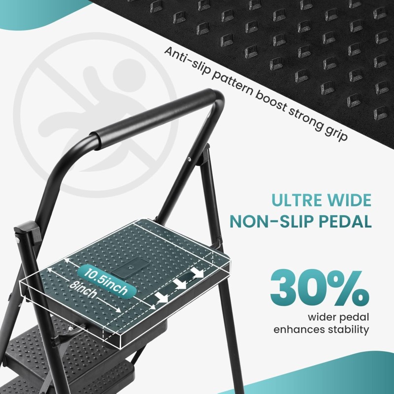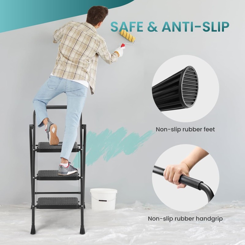 SMUG Step Ladder, 3 Step Stool Foldable with Anti-Slip Pedal & Comfortable Handrail, 800lbs Capacity Sturdy Steel Ladder, Protable Heavy Duty Step Stool for Kitchen, Garage & Outdoor Use, Black