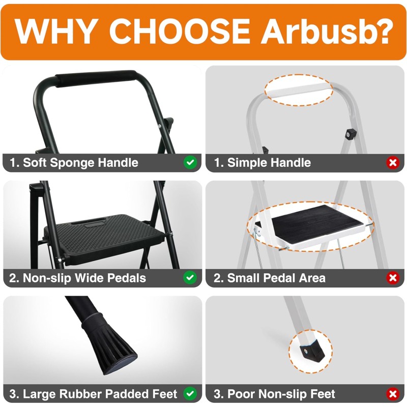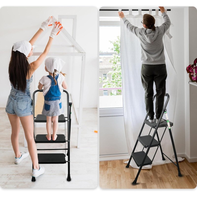 3 Step Ladder, Protable Steel Folding Stool with Wide Anti-Slip Pedal, 500lbs Sturdy Steel Ladder, Black